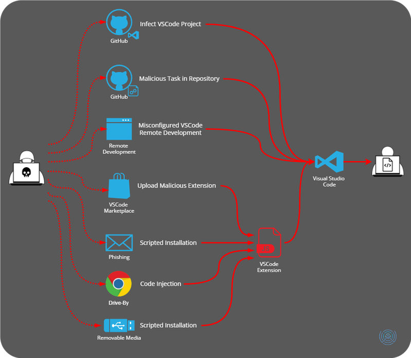 As part of the research I created a threat model of how an adversary could obtain initial access to a developers VSCode instance. The following diagram shows the different options an adversary has to achieve this goal, from attempting to infiltrate the VSCode project itself to accessing a misconfigured remote development environment.