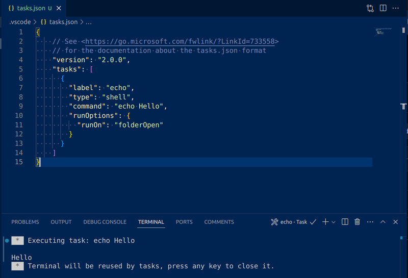 type: 'shell' | 'process';: specifies whether the custom task is executed as a shell or a process.command: string;: the command the shell will executerunOptions?: RunOptions;: Defines when and how a task is run. TheRunOptionsinterface allows us to specifyrunOn, when the task is run with only two optionsdefault: The task will only be run when executed through the Run Task command.folderOpen: The task will be run when the containing folder is opened.