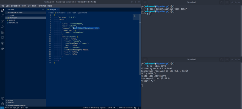 Whilst these are known techniques, the creative part is how to obfuscate the malicious task in the repository and avoid detection. VSCode supports Compound Tasks which allows several linked tasks to be defined and executed. This could be used to make a task file that is very hard to understand upon review or linking between different coding languages for execution. Another method could be establishing a benign Task in a trusted repository only to make it malicious later once it is established in many developer environments.