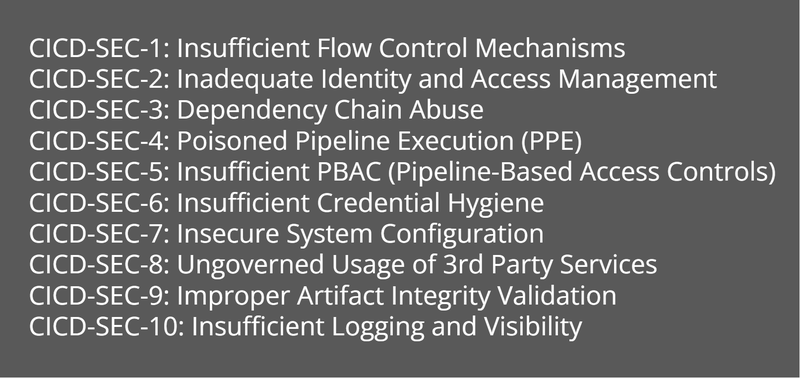 A quick search for “CI/CD security risks” or “securing your CI/CD pipeline” you’ll get a mixture of results based on what I previously discussed as industry is primarily focussed on putting security into the CI/CD pipeline. So to save you time, OWASP has a very good top ten CI/CD security risks. If you’ve never seen the list, I highly recommend reviewing each risk to understand how an adversary could use them to compromise the pipeline.