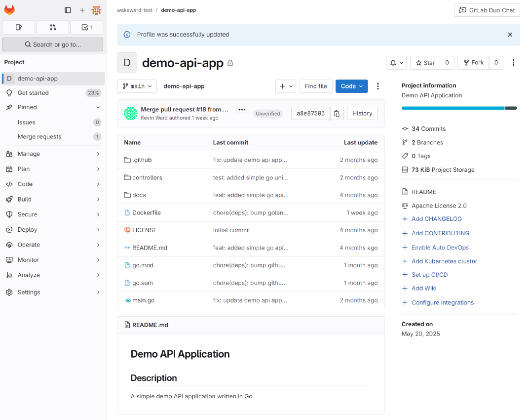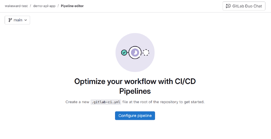 As we already have a repository, we’ll only configure “Run CI/CD for external repository”. Once we get past a couple of sign up pages, we can import our demo-app project to a GitLab Group (wakeward-test).