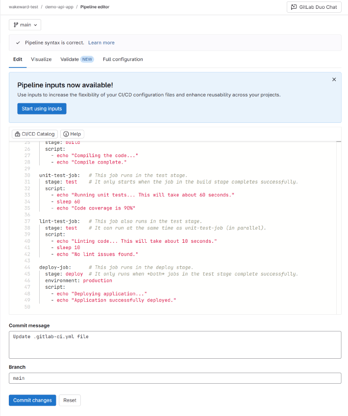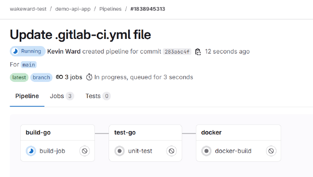 With all this in place, the pipeline definition file can be committed to the repository (main) which will trigger the job.