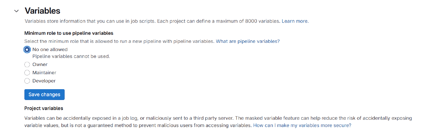 Firstly, GitLab applies a level of RBAC to defining the pipeline variables, these can be “No one allowed”, “Owner”, “Maintainer” or “Developer”. This reduces the risk of an unauthorised user exposing the credentials.