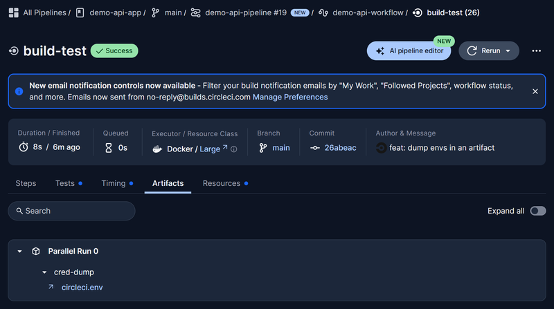 If we navigate to “Artifacts” in the UI, we can see the circleci.env.