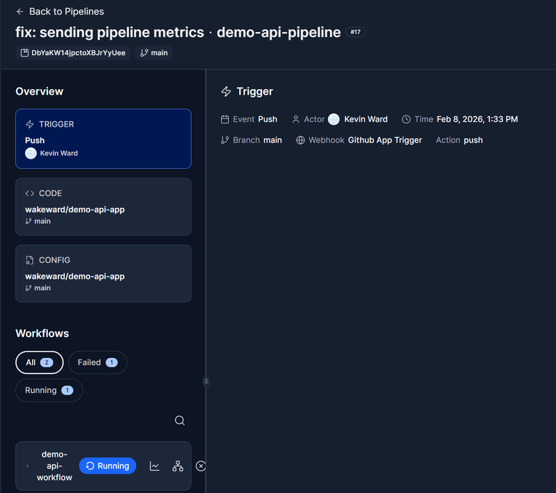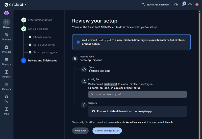 As part of setting up the project, you will be asked to setup the pipeline. This requires a connection to a VCS which we’ll use GitHub and specifically only allow access to the demo-api-app repository.