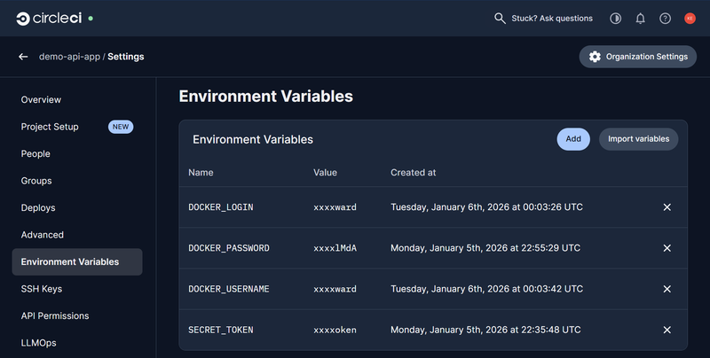 build-testjob had access toDOCKER_PASSWORDandSECRET_TOKENdespite them only being used indocker-build-push. Compromising any job in the workflow exposes the full set of project credentials. - Build log masking has a blind spot — CircleCI masks secrets when they appear in console output, but artifact contents are not scanned. Writing environment variables to a file and storing it with